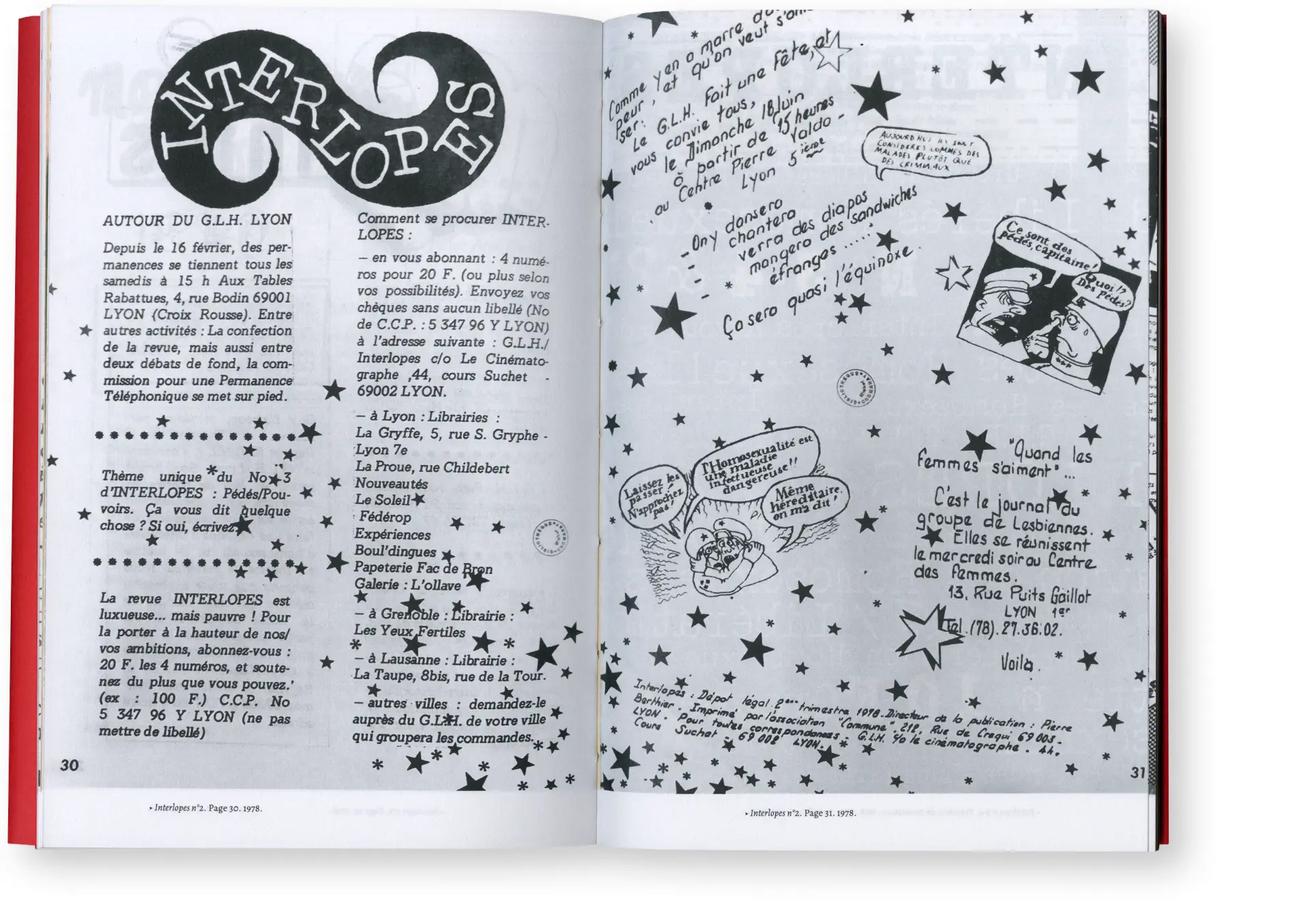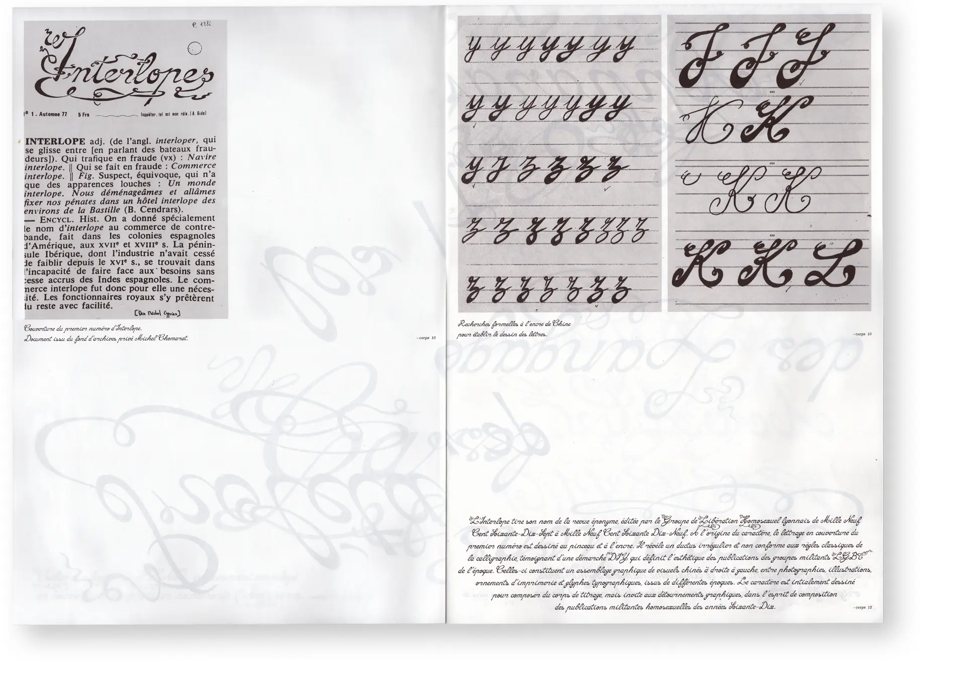 Spécimen d'un revival typographique d'un lettrage en couverture du premier numéro de la revue Interlopes, publié par le Groupe de Libération Homosexuel lyonnais en 1977. Télécharger la fonte