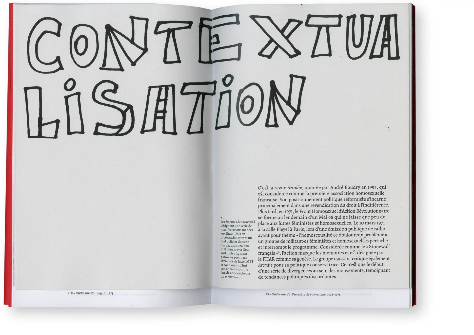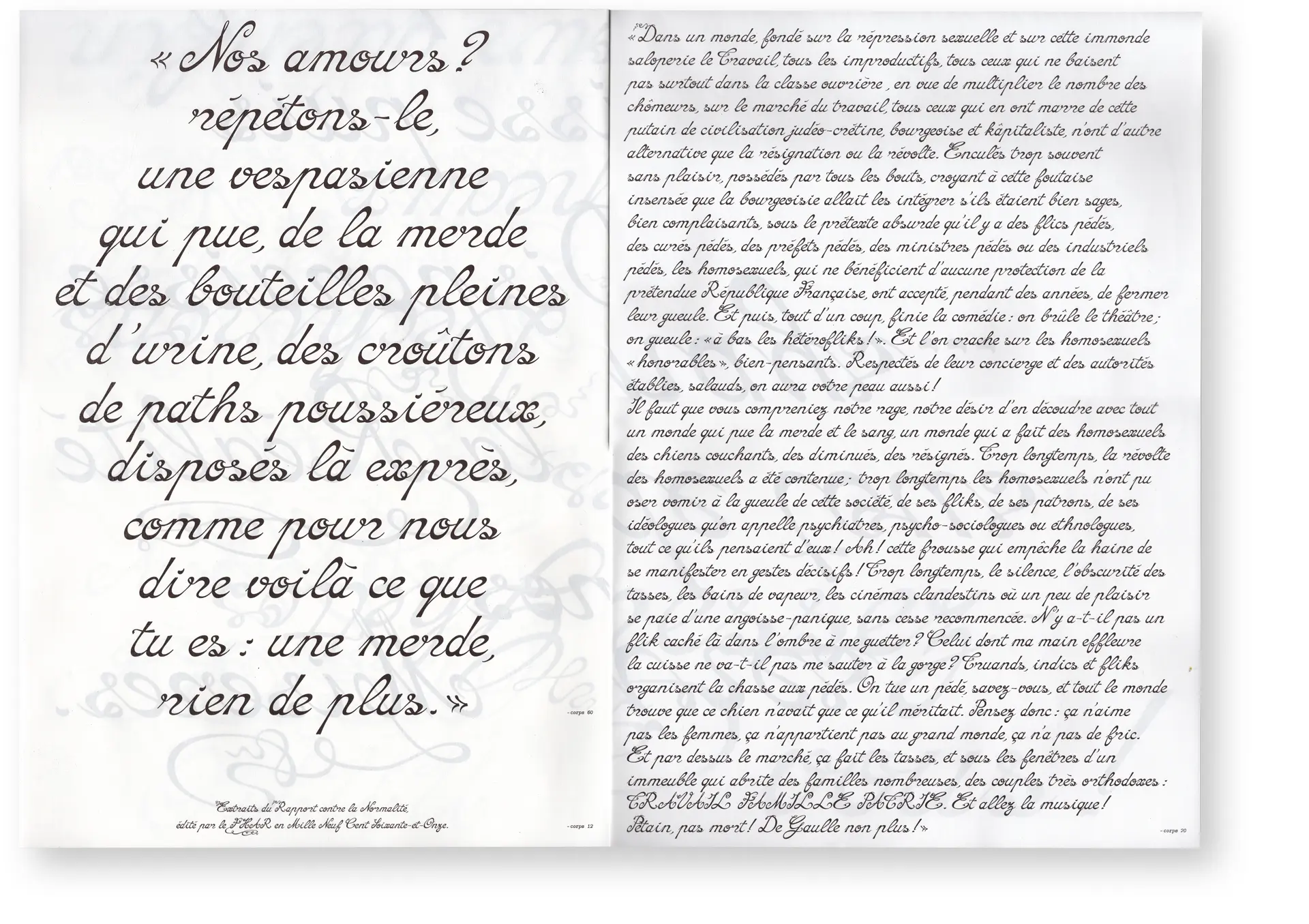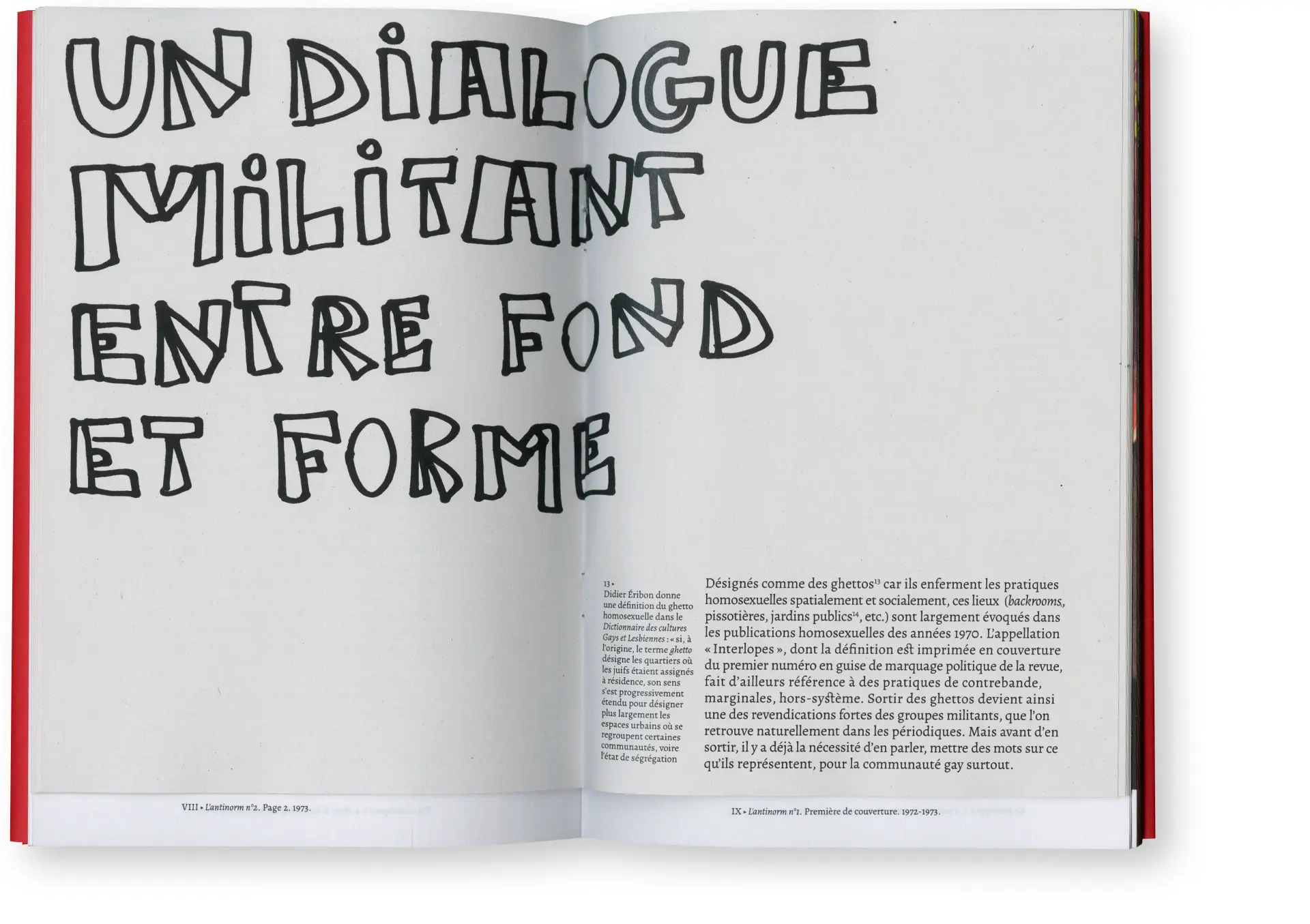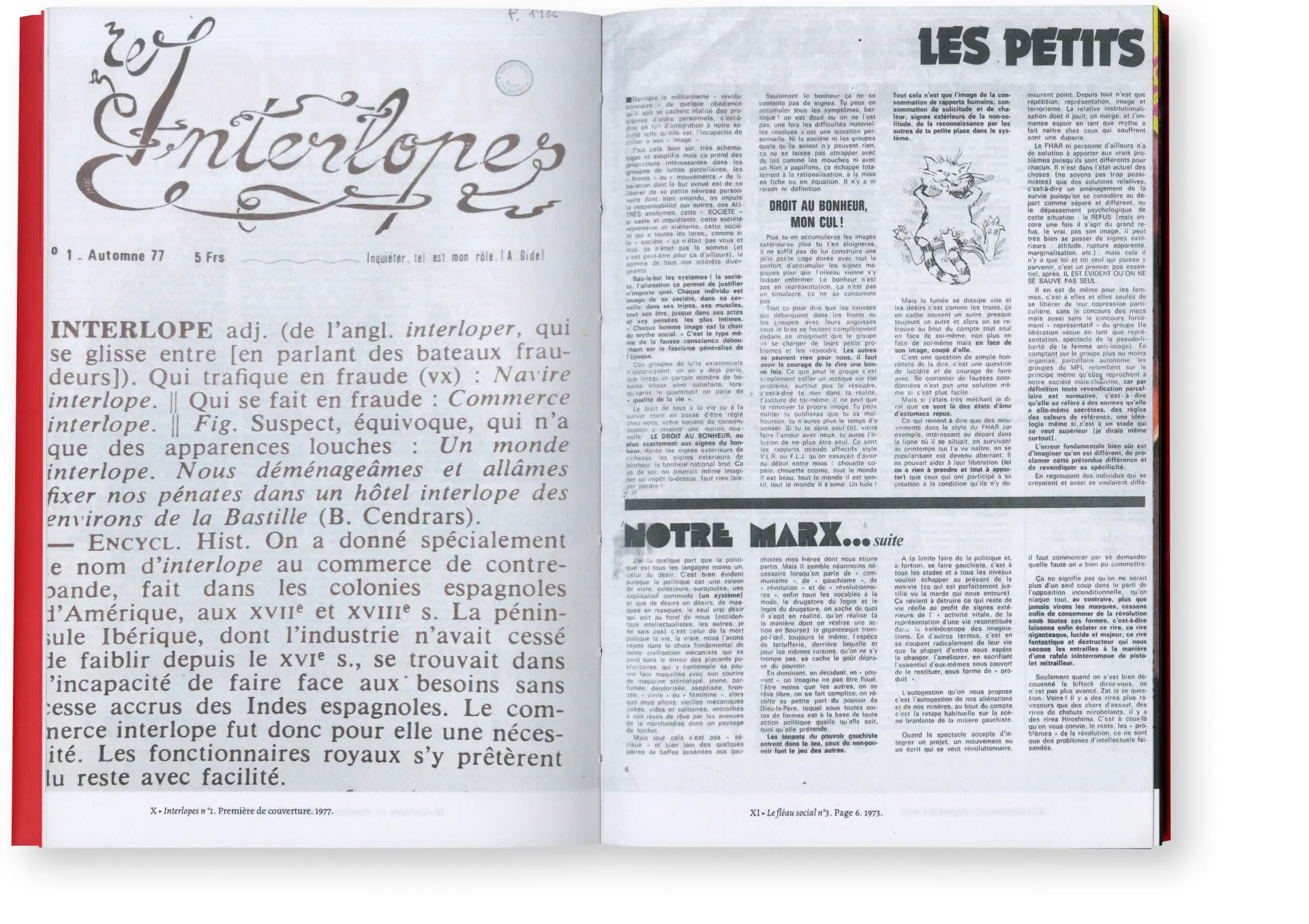 Specimen of a revival from a lettering on the cover of the first issue of the activist magazine Interlopes published by the Homosexual Liberation Group from Lyon in 1977. Download the typeface